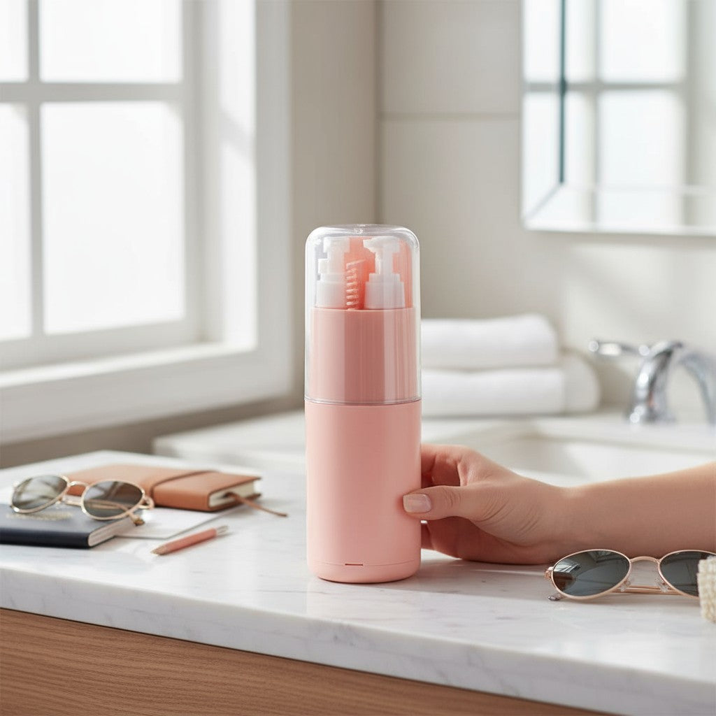 All-in-One Travel Kit: Includes 2 liquid dispensers for shampoo, body wash, or lotion, a toothbrush holder, toothpaste space, mouthwash cup, comb, mirror, and towel compartment – everything you need in one compact case.